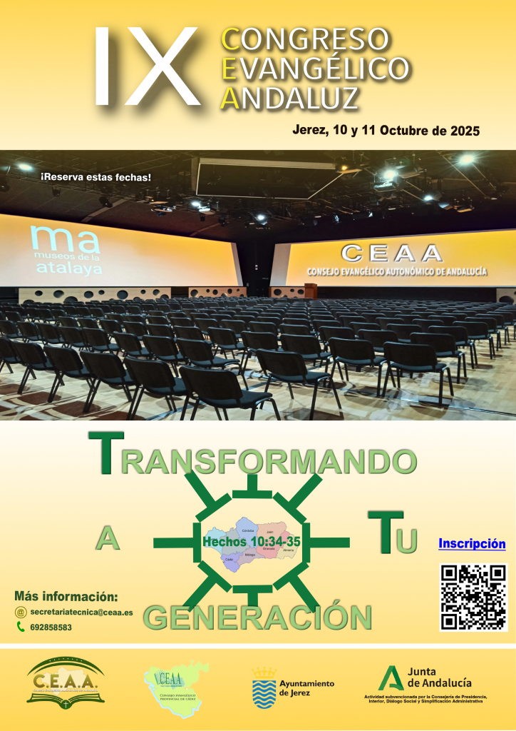 Jerez de la Frontera fue sede del IX Congreso Evangélico Andaluz bajo el lema "Transformando tu generación", un evento que reunió a representantes de comunidades evangélicas de toda Andalucía. El congreso tuvo como objetivo fomentar el intercambio de ideas y la reflexión compartida entre los asistentes.